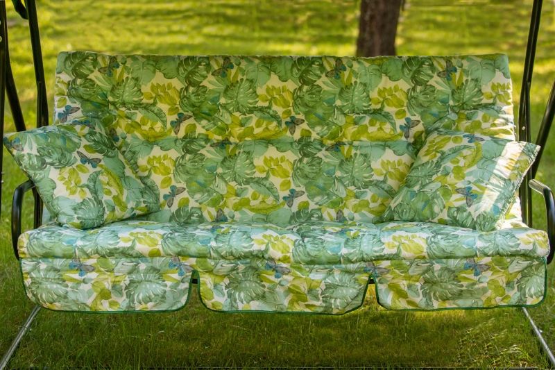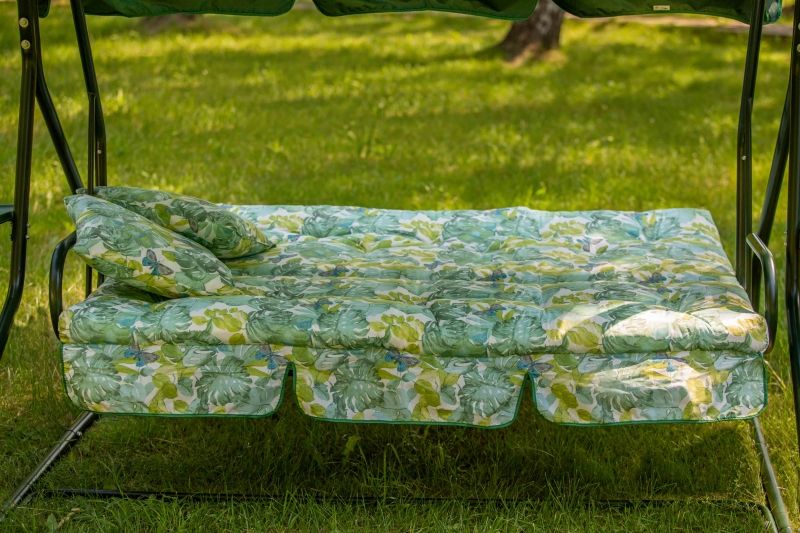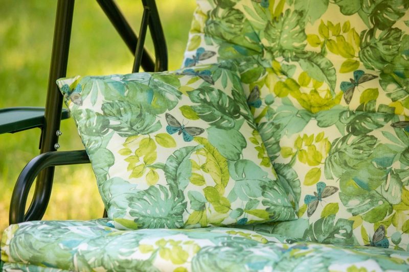 Мягкий элемент: ткань 45% п/э – 55% хлопок, плотность 108-111 г/м2 , наполнитель мягкого элемента 5 см поролон + 3 см синтепон , увеличенная высота спинки. Декор мягкого элемента тафтингом, наполнитель подушек (листовой поролон 50мм). Подушки – 2шт.